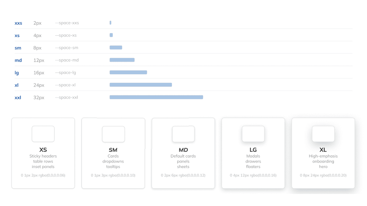 Full spacing scale, grid system, layout zones, and density definitions — design-facing and developer-facing values side by side.