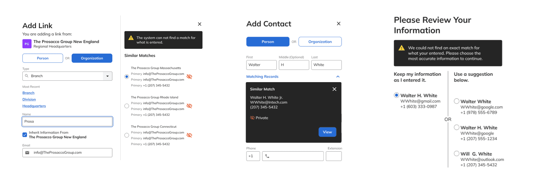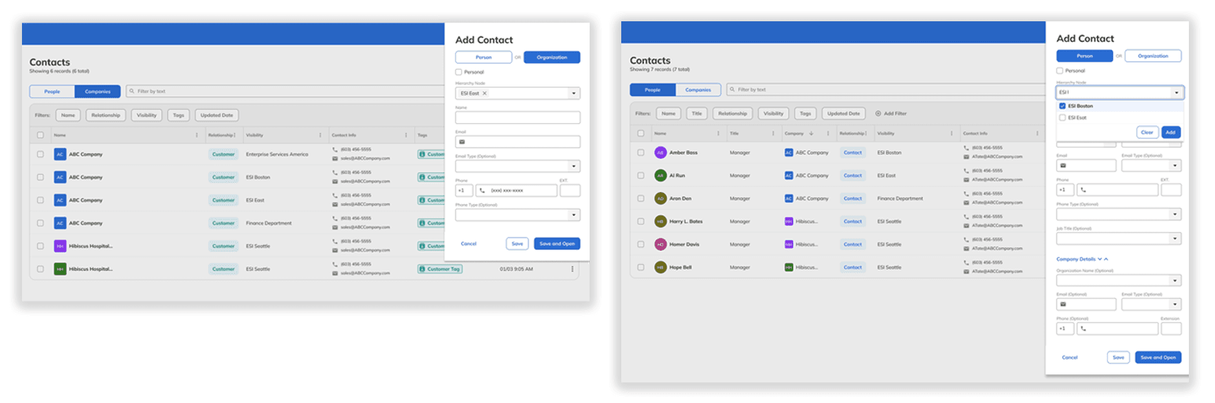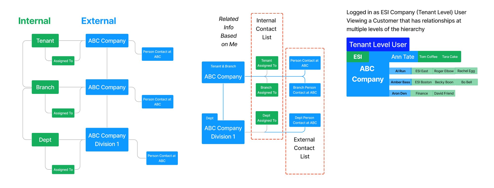 Contact type ambiguity eliminated — every person placed correctly in the org hierarchy at point of entry, with role and relationship explicit.