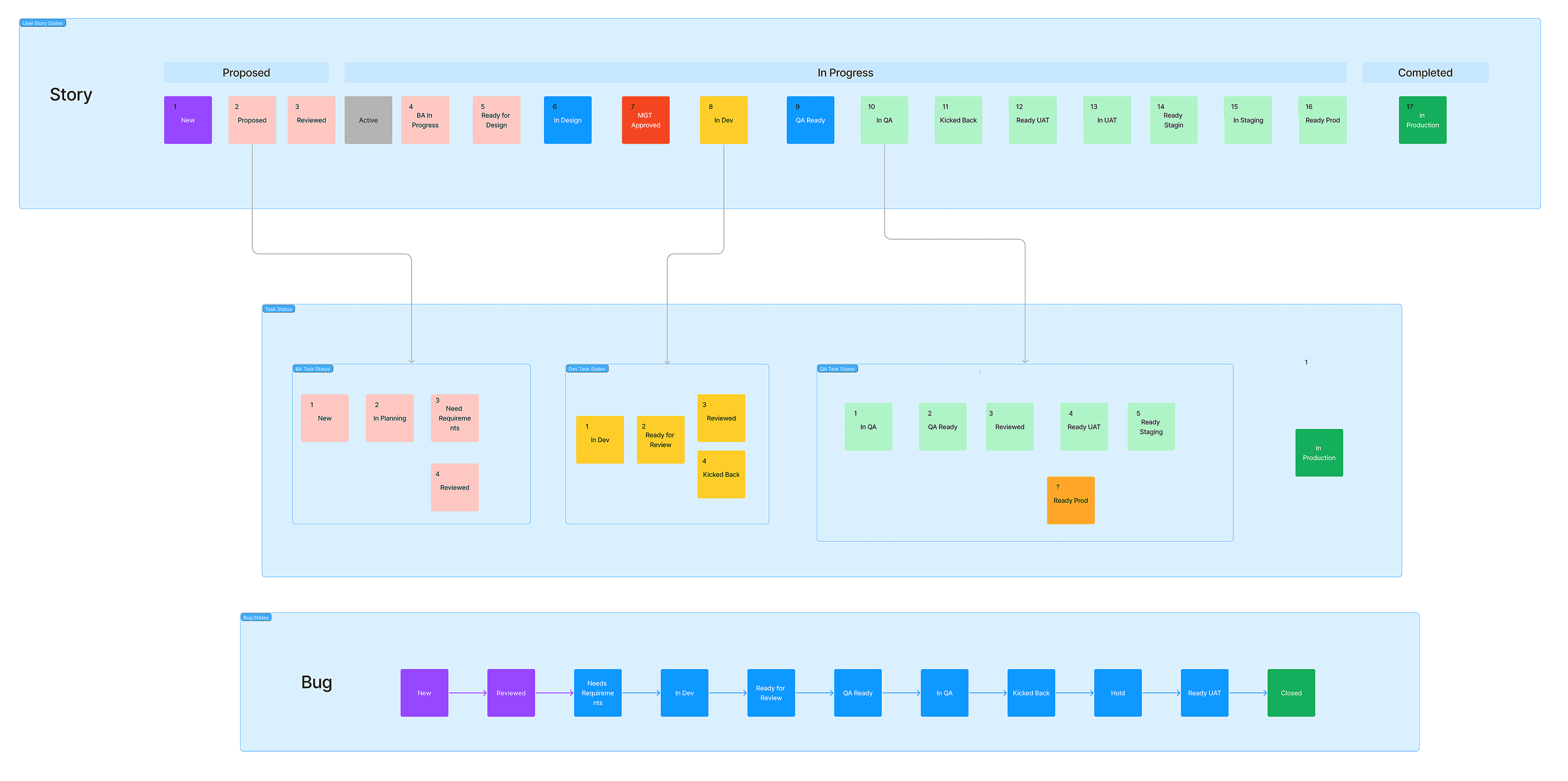 Stories moved through defined states in sequence — stalls at handoff points became visible and addressable.
