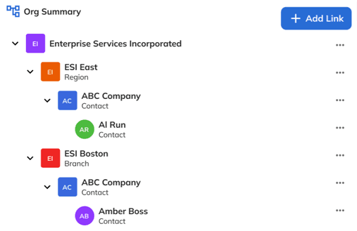 Org Summary embedded directly in the contact record. No separate navigation required.
