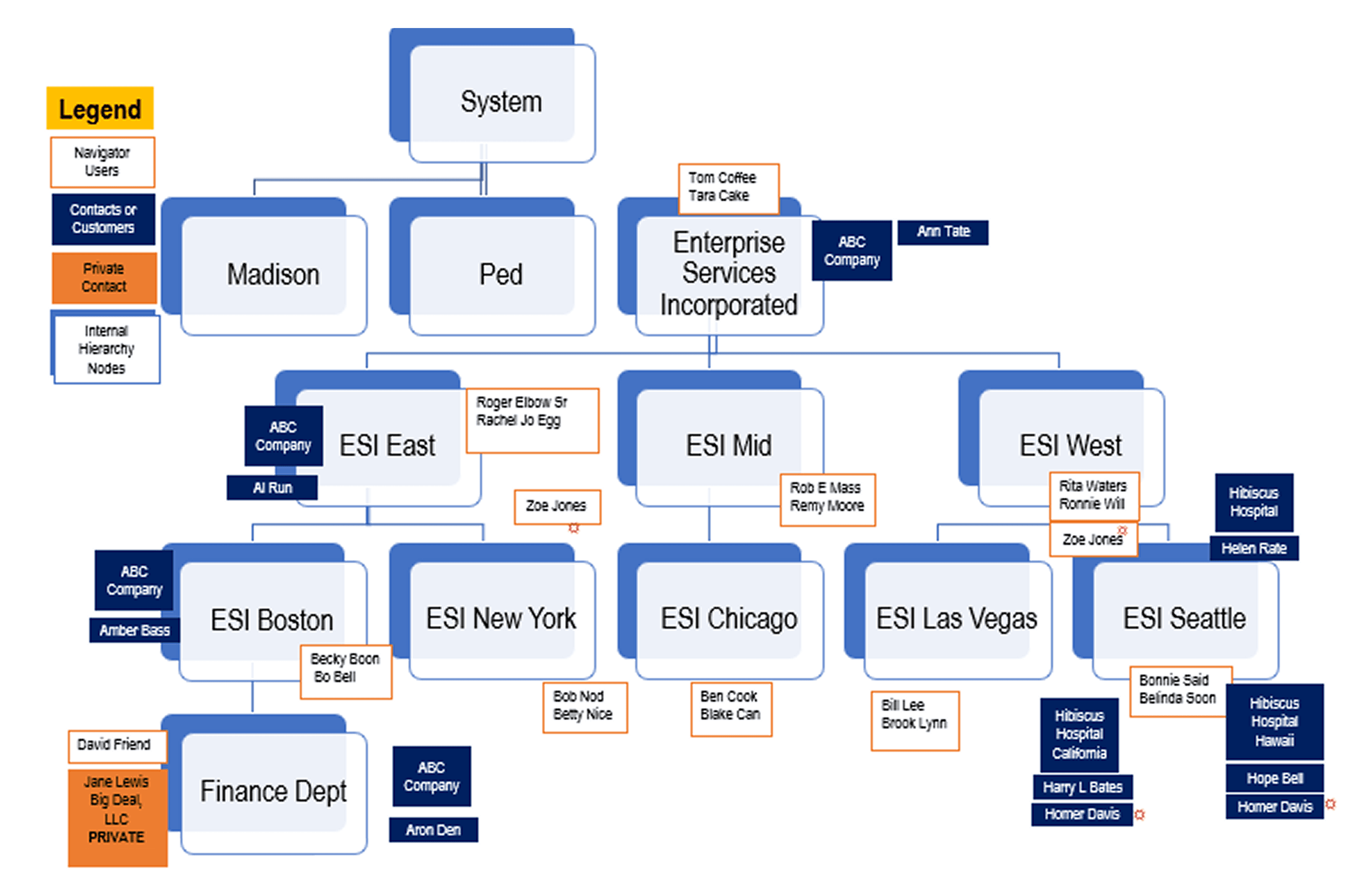Full org hierarchy with Private contacts visible as nodes. Relationship exists — details protected.