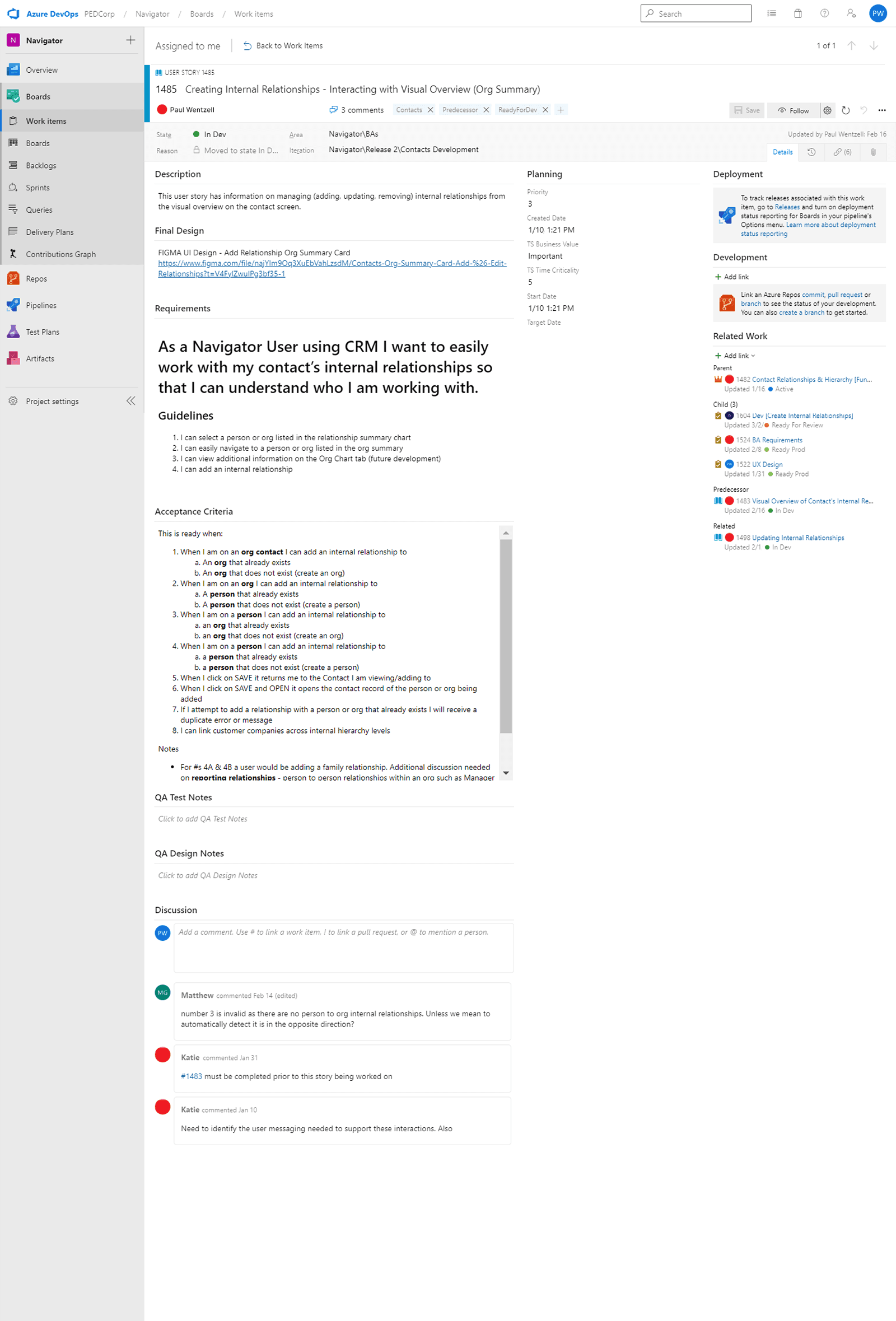 Developers were filling in story gaps their own way and QA had no consistent baseline to test against. Working with the PM, I designed the story structure and Azure DevOps state workflow — explicit criteria gave QA something to test directly against, kickbacks became documented and traceable, and stories stopped stalling at handoff.