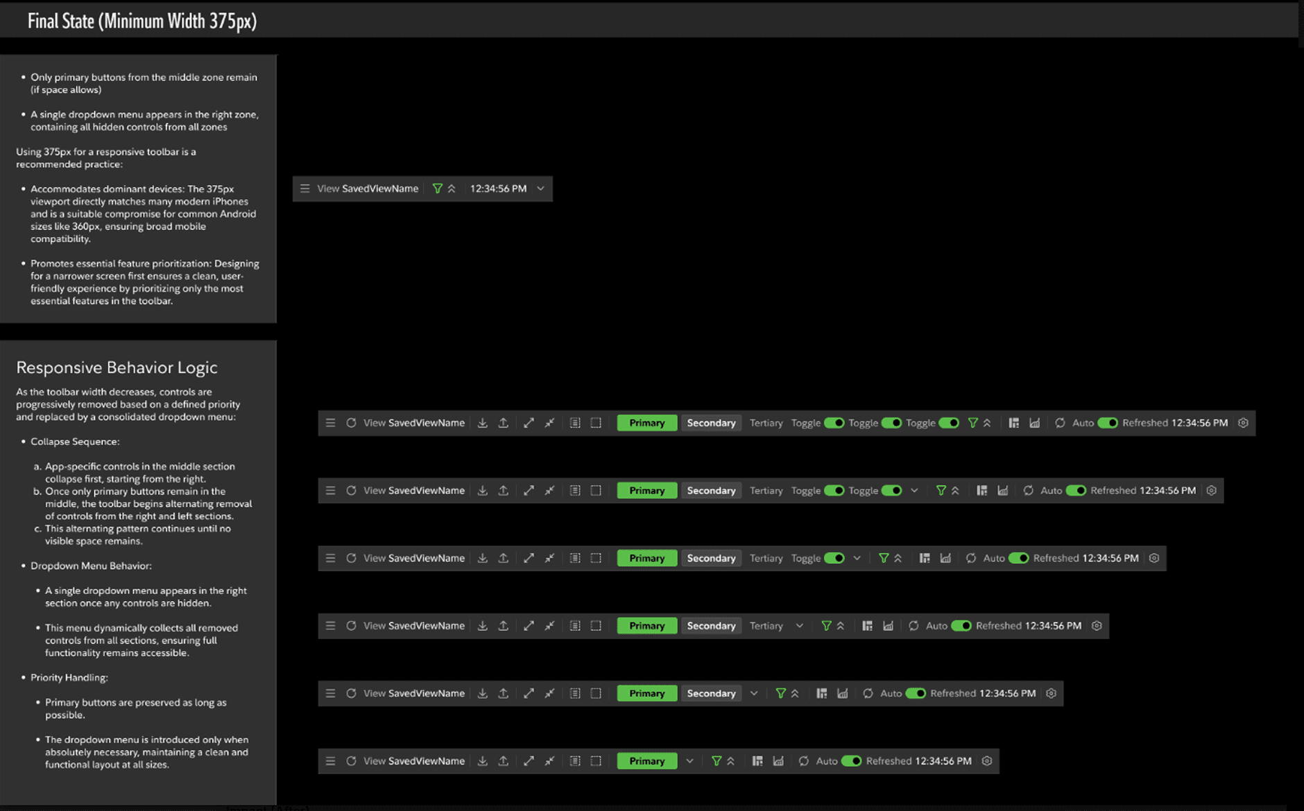 Responsive toolbar spec — three zones with documented collapse behavior and priority rules
