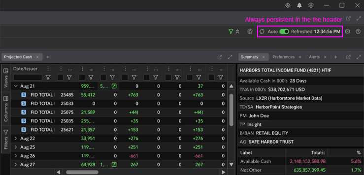 Users had no way to know if the data they were looking at was current. Systems updated every 12 hours but there was nothing in the interface telling you that. Cash Avail funds updated every 30 minutes. Non-cash available funds updated once a day. Two different cadences, neither visible anywhere in Global Cash.