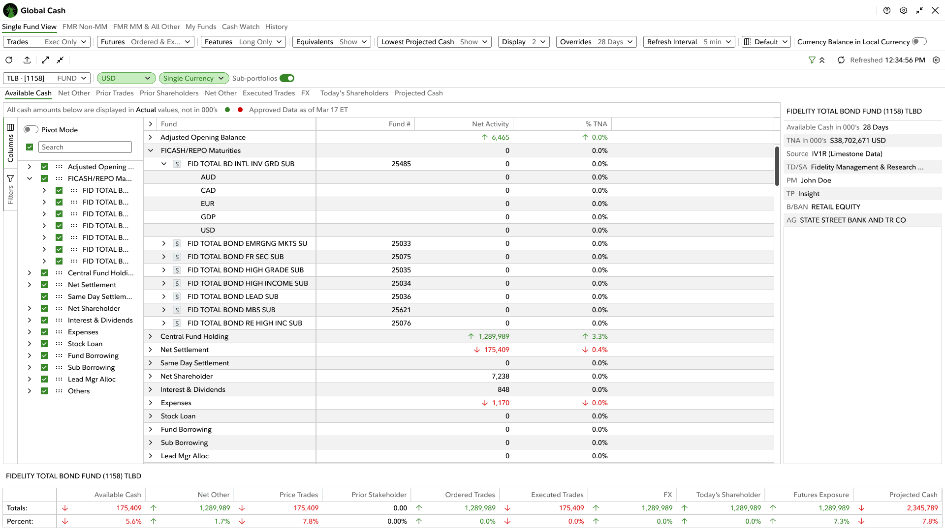 Global Cash trading workspace — AG Grid with column configuration panel and multi-fund data density