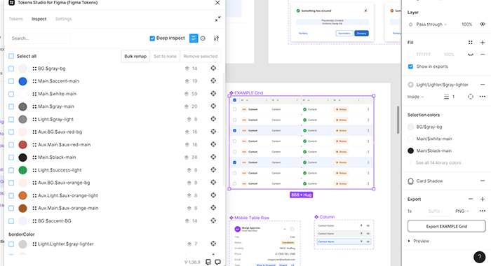 Tokens imported from GitHub via Tokens Studio. Named taxonomy established: $namespace.$token-name $gray-light, $accent-main, $aux-red-main. Every color, spacing value, and typography decision centralized and referenced the same way across every component.