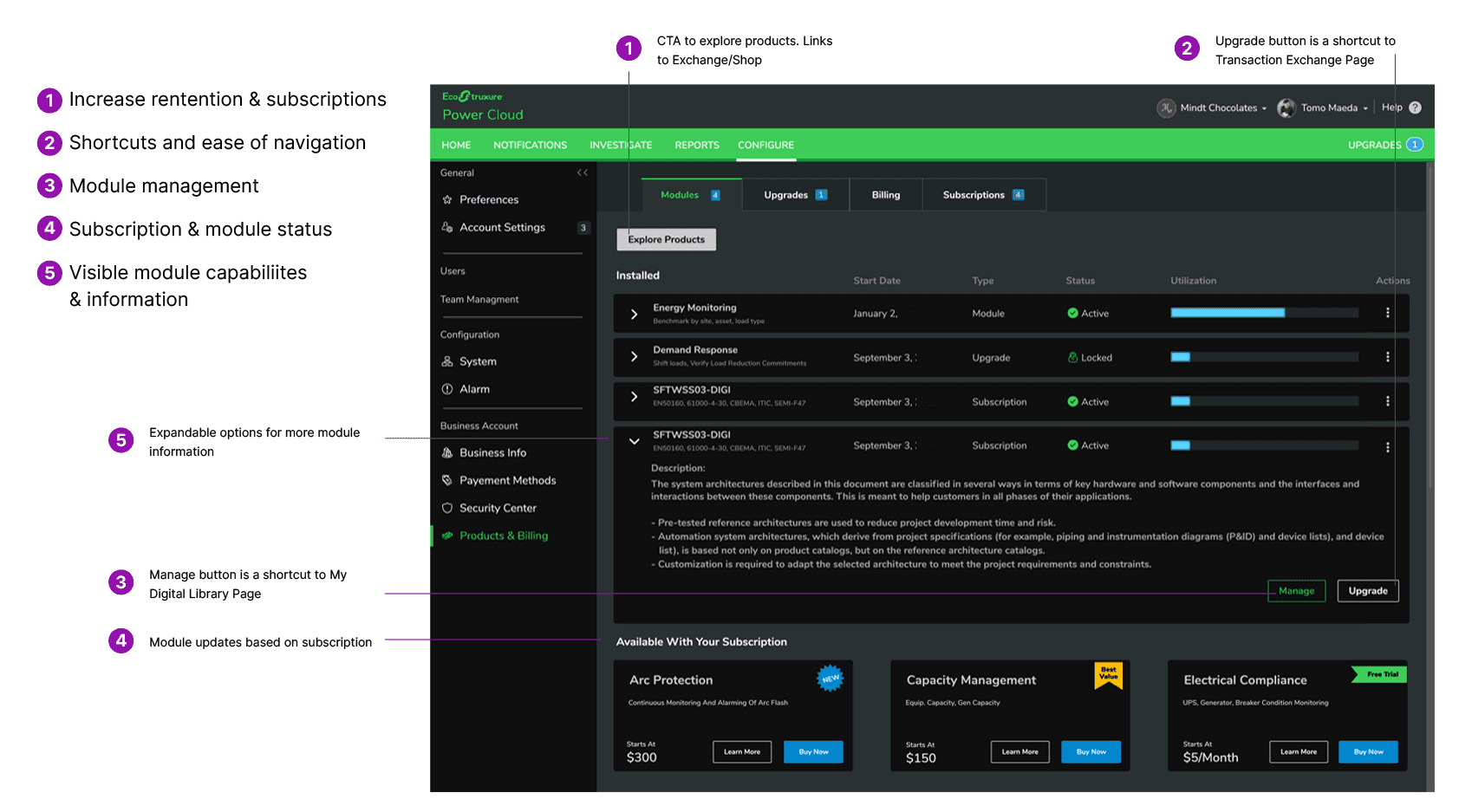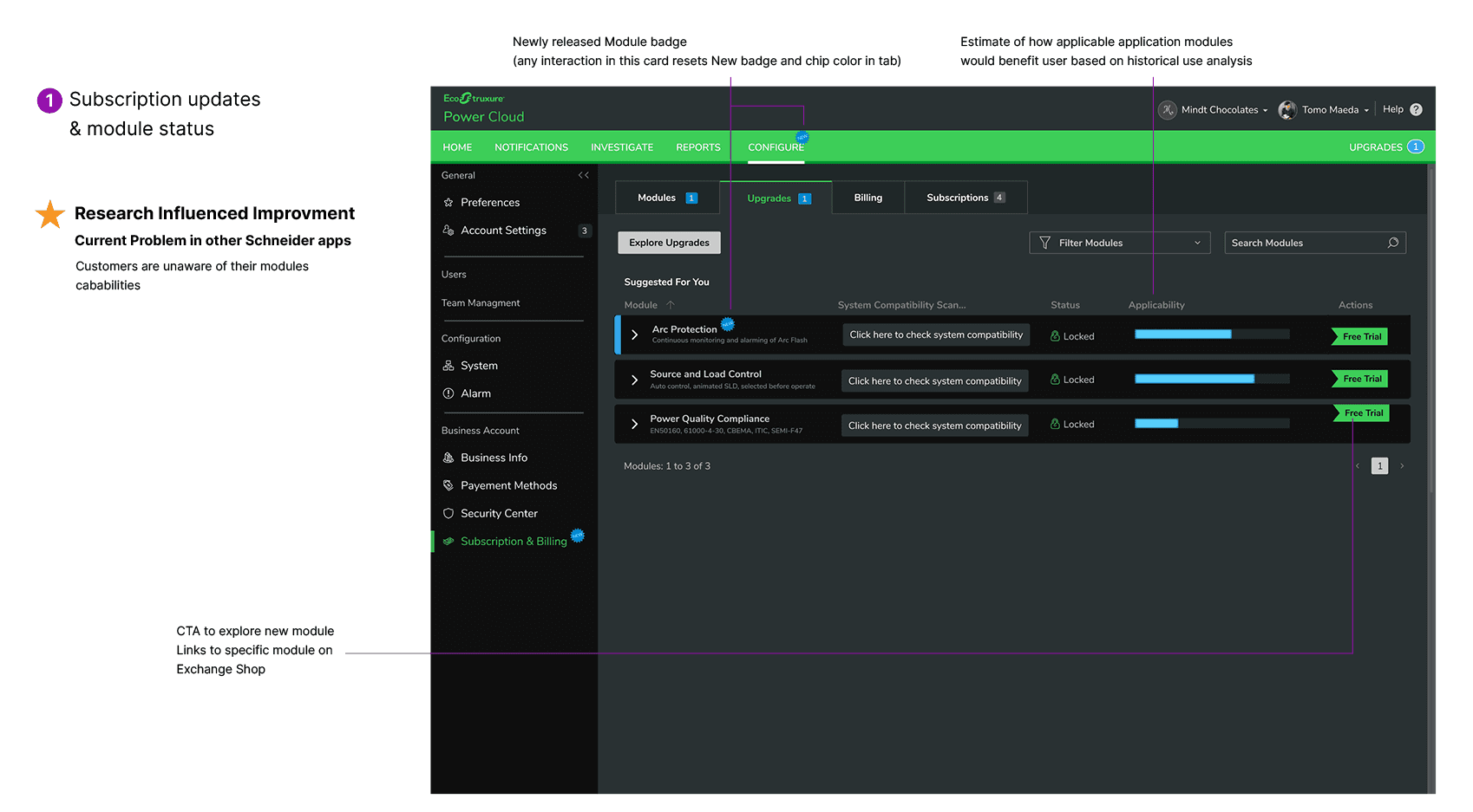 EcoStruxure runs on .NET Framework and Azure IoT infrastructure — the SmartConnector middleware layer handles subscription logic and feature activation in C# and .NET. I worked directly with engineering to understand how the backend model surfaced in the UI, so design specs accounted for real activation behavior, not assumed behavior. That alignment prevented logic gaps between design and build.