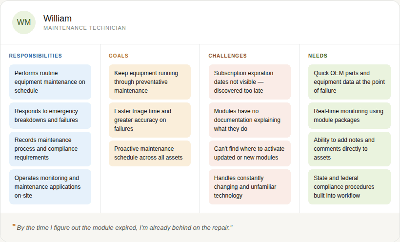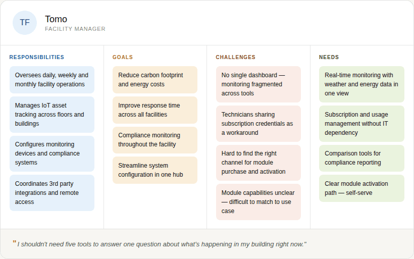 Tomo and William weren't defined upfront — they emerged from interviews and workflow observations with Schneider customers recruited through internal Schneider channels. I led recruitment coordination with the Schneider team to ensure we observed real activation and renewal moments, not recalled ones. Facilities managers and maintenance technicians observed directly as they subscribed to new modules and managed existing ones — giving product and engineering a shared customer model before any design decisions were made.