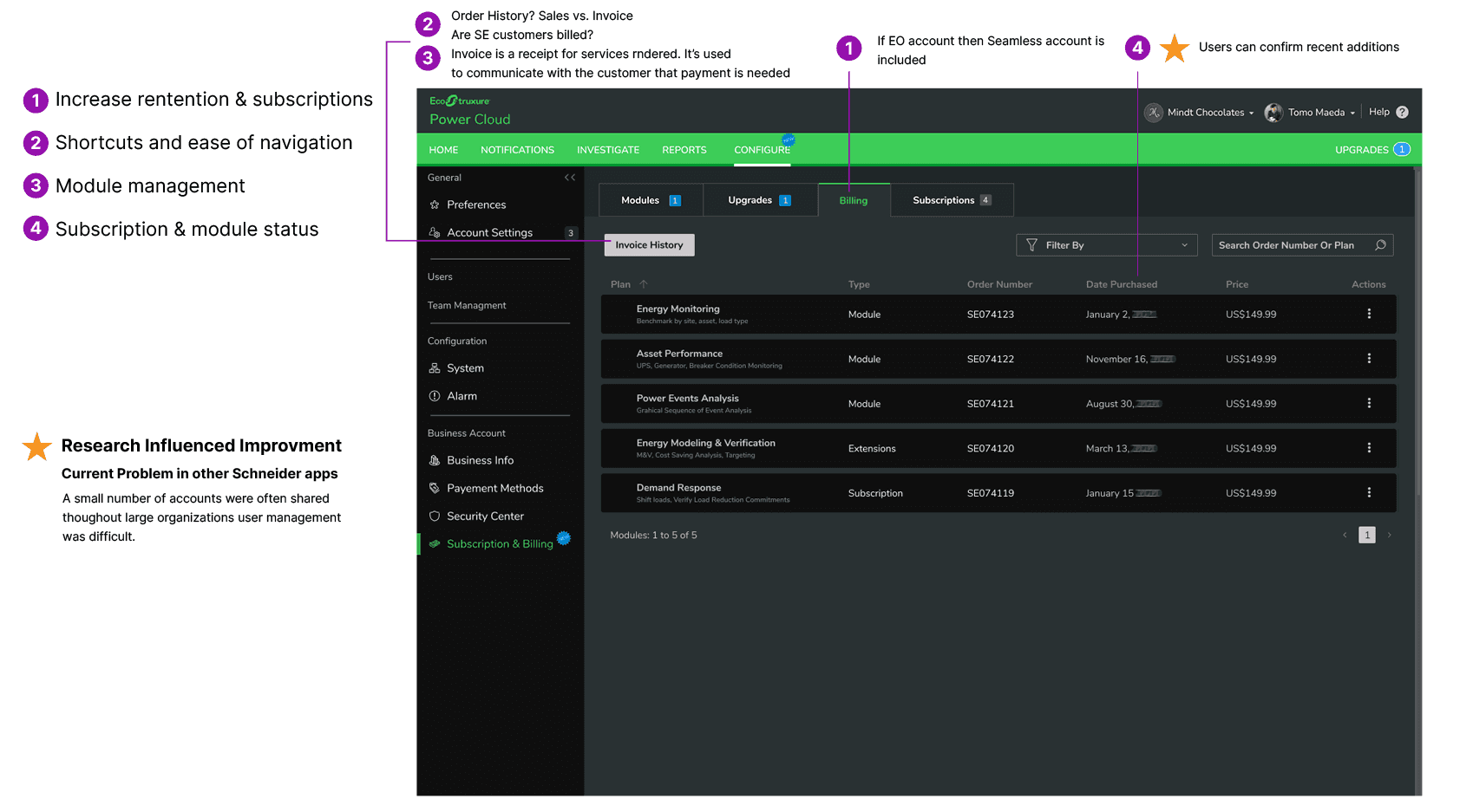 Led UX research and design for EcoStruxure subscription management — from activation mapping through wireframes and final UI.